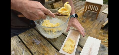 Aiden thought why shouldn't he give this a go? He could offer it out to local landowners and farmers as a way of encouraging them in. So Aiden got to work, he churned butter by hand using an old school churn. His colleague at An Creagán carved him a beautiful wooden vessel to hold the butter, and he wrapped and tied it in a nettle cord and buried it in Creggan Bog where it lay for 2 months.