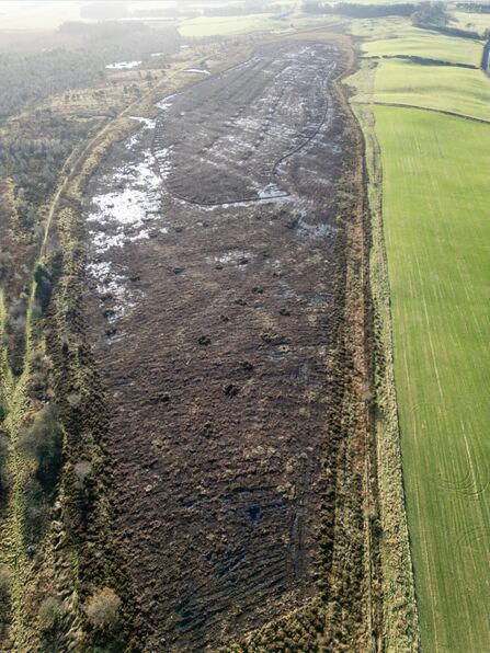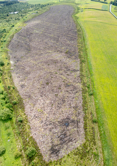 Aerial view of an oblong-shaped brown patch of land with a strip of conifer trees on one side and green fields on the other. There are visible drains running obliquely across it.